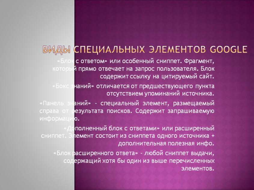 Специальный элемент – это функция поиска, когда извлекается фрагмент страницы или сниппет, отвечающие на запросЗапрос — слово или символ, вводимое в строке выдачи.Используется расширенный поиск:1) Оператор «+» (или кавычки) перед требуемым словом ищет запросы с…Перейти к словарю терминов пользователя, показываемые в специальном выдачи. Существует несколько видов специальных элементов: