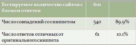 Для дальнейших исследований были отобраны 601 блок с ответами. В 540 случаях, что составляет 89.9%, специальное поле заполнялось идентично сниппету сайта источника. (От ред. Мы уверены, что для отечественного интернета эти цифры значительно ниже).