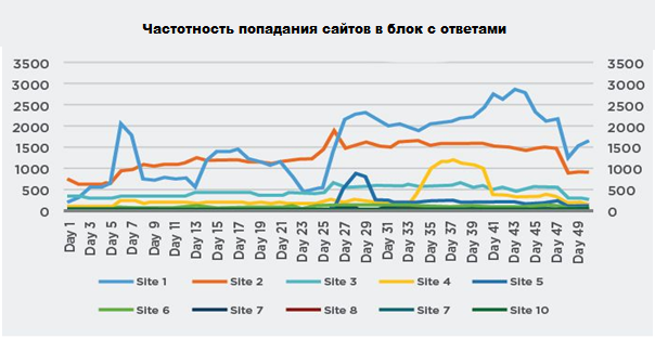 Из результатов следует, что Google активно тестирует алгоритм вывода коротких ответов на запросы пользователей. Здесь на графике за День принимается контрольная дата проверки для выбранных ресурсов. Как видно, некоторые проекты испытали всплески частотности попадания в блок с ответами. Что означает не только высокую конкуренцию в нише. Но косвенно подтверждает факт отработки алгоритмов Гугл на большом числе сайтов и запросов пользователей. Все, что мы видим на графике напоминает процесс А/В тестирований.