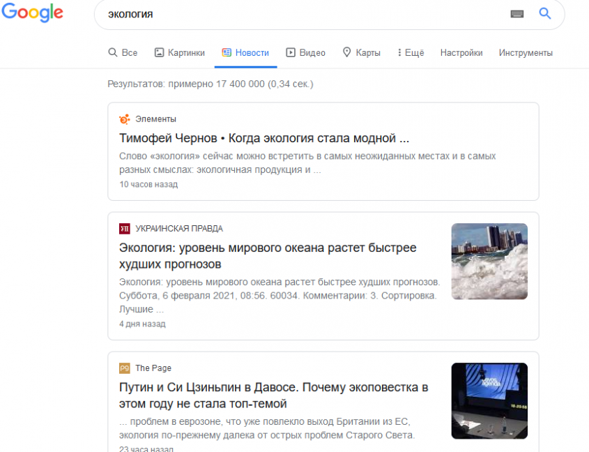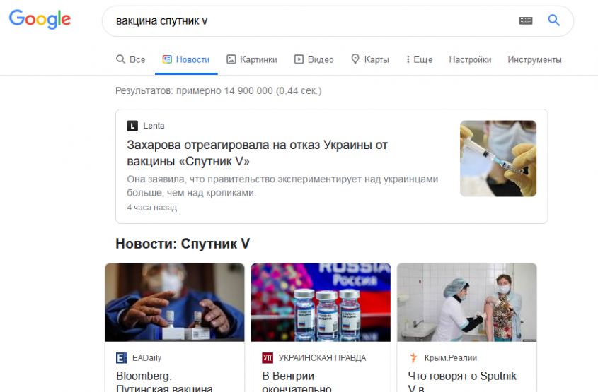 Пример вкладки Google Новостей (русскоязычный интернет):