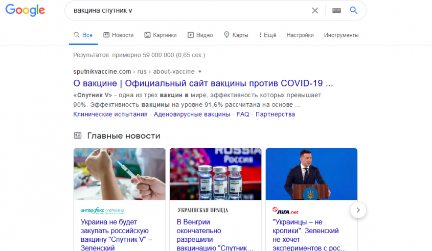 Например, если идет поиск информации по “Вакцина от коронавируса” мы видим в выдаче обозначенный специальный элемент поверх остальных результатов. Блок содержит ссылки на страницы с новостями на данную тему. К примеру, это может быть информация о планах производителей вакцины, высказывания глав государств, прочее. Тогда как остальные ссылки в привычных текстовых сниппетах топ 10 могут вести на обычные информационные статьи, в том числе обзоры, сравнения вакцин и т.д.