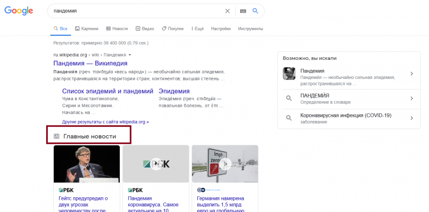 Карусель Главные новости уже сейчас встречается в верхней части страницы поиска помимо прочих результатов поисковой выдачи. Этот блок добавляется автоматически к выдаче, когда алгоритмы ранжированияНабор формул, в соответствии с которыми осуществляется формирование выдачи и ранжирование веб-страниц. Основная задача алгоритма ПС - продемонстрироватьПерейти к словарю терминов выявляют новые популярные запросы по конкретной тематике и есть ключевые слова в новостных публикациях, отвечающих интенту (интересу) отдельного конкретно взятого пользователя.