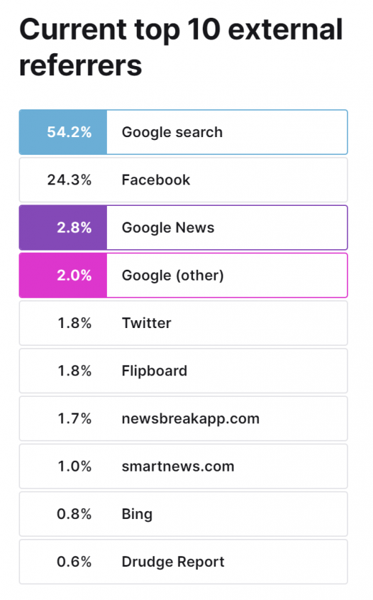 За последние 12 месяцев сервис зафиксировал, что Google Новости и поиск составляют более 50% реферального трафика для онлайн СМИ.