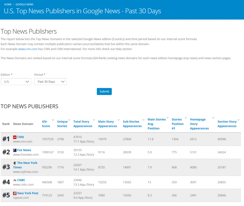 Журналисты, работавшие на крупные онлайн издания, знают, что конечная цель - дать читателям разностороннее правдивое освещение актуальных событий и популярных тем. Предоставляя отчеты о ведущих новостных порталах, подразделах и темах главной страницы Новостей Google, сайт NewzDash дает представление о факторах доверия и авторитете издателей в новостной индустрии с точки зрения Google.