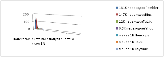 Сразу три поисковых системы вызывают интерес россиян, чей барьер не превысил 0.0001% от всех сетевых посещений. Это такие поисковики: