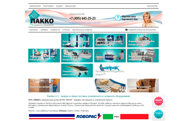 Packko.ru - это официальное представительство нашей компании в сети. Мы запустили первую версию веб-ресурса в 2012 году, когда приняли стратегическое решение развиваться не только оффлайн, но и онлайн. Нынешний - уже доработанный вариант сайта - является универсальным и многофункциональным. С одной стороны - это классическая корпоративная площадка с информацией о нас, новостями «Пакко», сведениями о партнерах, предоставляемых услугах, контактной информацией. С другой стороны на Packko.ru есть большой каталог предлагаемой продукции - складского и упаковочного оборудования. В нем же можно оформить доставку - заполняется форма, где указываются контактные данные и другая информация клиента. Фактически в этом смысле - это что-то среднее между сайтом-каталогом и полноценным интернет-магазином (без корзины).