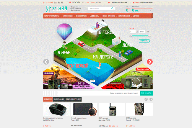 Одной из главных визитных карточек сайта «Я заснял» является интерактивная анимация на главной страничке с возможностью быстро отфильтровать (подобрать) товар, который подходит для использования на земле (дороге), в небе, под водой, в горах и т.д. Эта анимация была разработана в самом начале существования моего бизнеса и появления сайта и остается на главной практически без изменений.