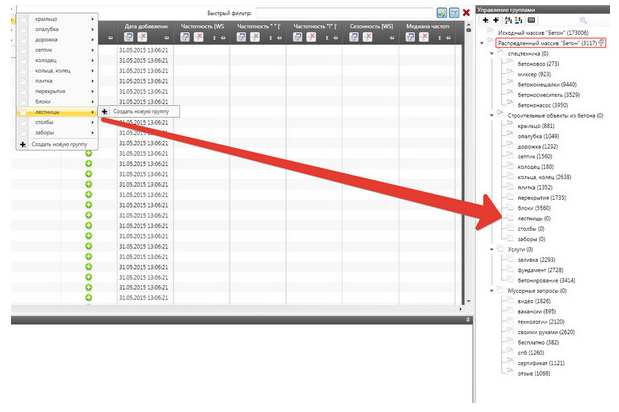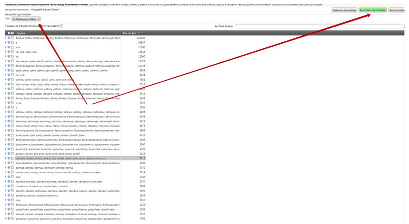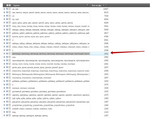 Ещё раз проводим группировку запросов. Наша задача на данном этапе - объединить в группы все ключи, которые имеют отношение к бетону. По результатам группировки появится много интересных групп. Одна из таких - "Лестницы", включающая 2900 запросов.