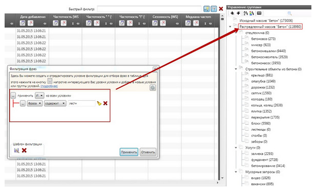 Снова заходим в проект, используем фильтрФильтр - поисковый алгоритм, используемый по отношению к сайтам, которые применяют черные методы раскрутки, пытаются манипулировать с выдачей…Перейти к словарю терминов , позволяющий отобрать данные слова: "фраза содержит "лестн". После фильтрации получаем выборку ключевых слов, которые следует перенести в предварительно созданную группу. Аналогичные действия предпринимаем для других групп и осуществляем распределение ключей.