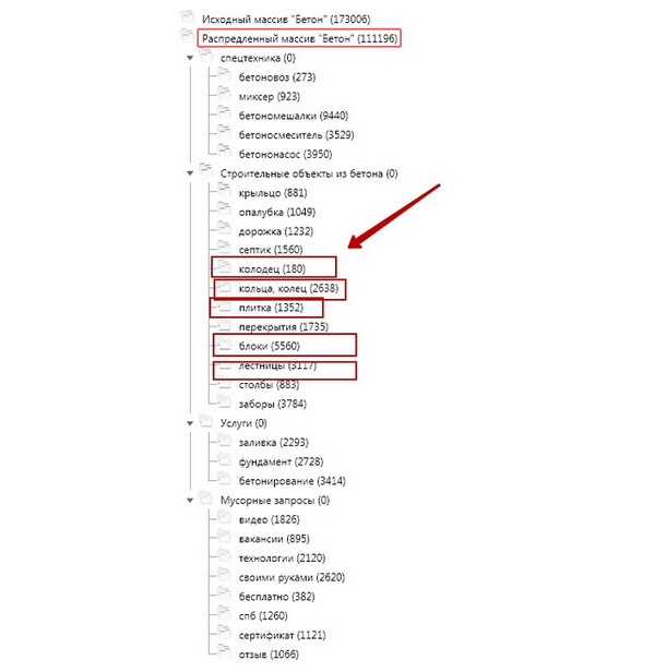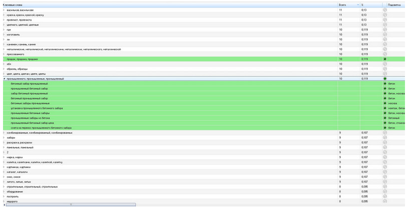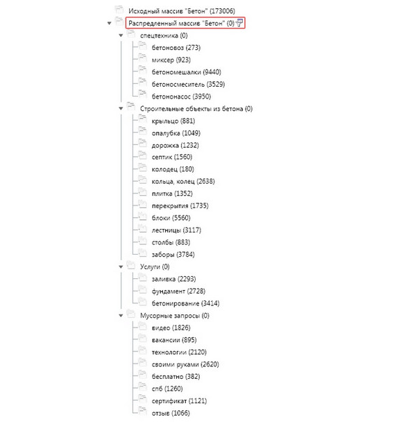В соответствии с нашим примером, мы создали три главных направления, диктуемые бизнесом - "Спецтехника", "Бетонные строительные объекты" и "Услуги". Далее по этим трем направлениям мы распределили ключи, что позволило получить вменяемую структуру массива запросов.