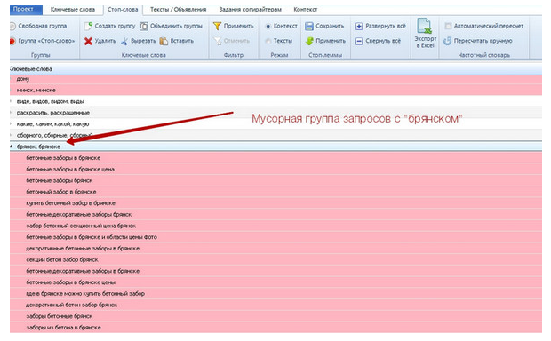 При условии, что фирма работает в столичном регионе и области. В нашем случае группа "Брянск" - это мусор, как собственно и другие географические слова, некоторые некоммерческие запросы. Чтобы очистить около 1000 подобных ключей нужно порядка 6-7 минут.