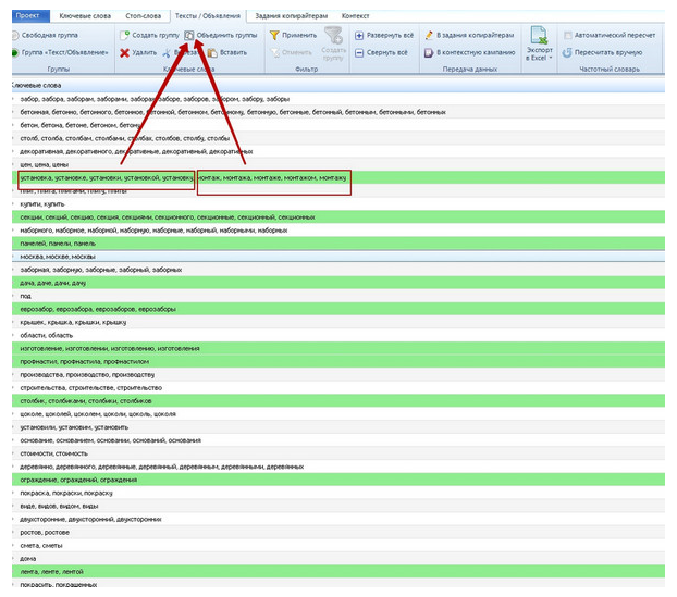 Группировка продолжается. Синонимичные фразы и запросы можно объединять - к примеру - "монтаж" и "установка".