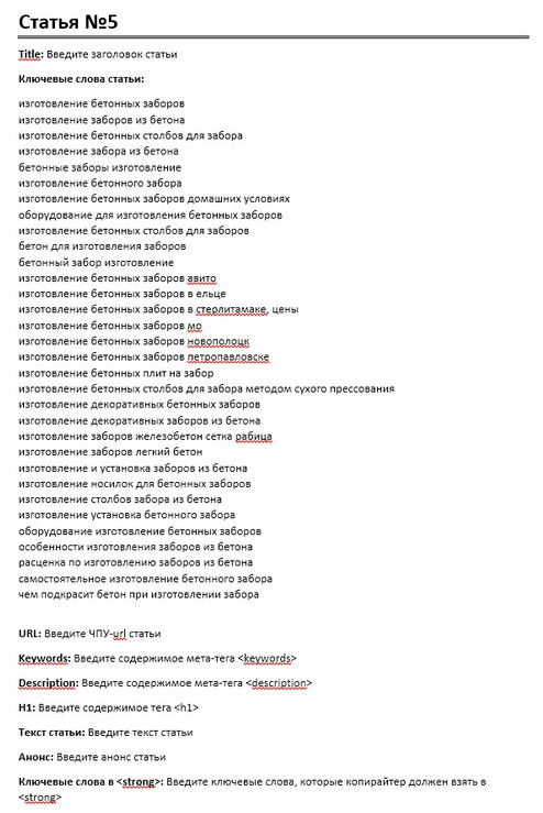 Так, одна из статей, которая позволит привлекать НЧ-трафик у нас посвящается изготовлению заборов из бетона. Она включает более 30 ключей. Но это уже работа автора. Полученный файл нужно передать ему для создания статей и заполнения тегов.