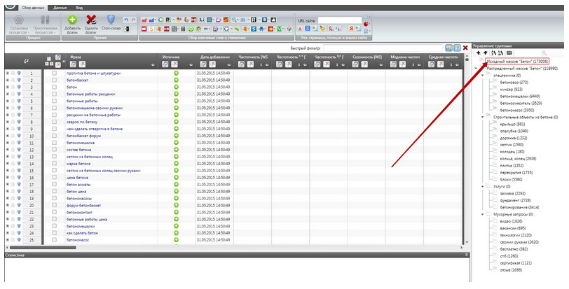 Все полученные запросы вставляем в Кей Коллектор. В общей сложности у нас 173006 фраз. Это большое количество. Первая задача - группировка. Продвигаемый веб-ресурс предлагает транспортировку бетона, продает бетономешалки и оказывает смежные услуги.