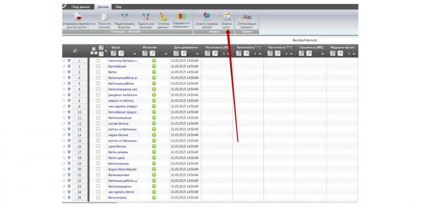 В Кей Коллекторе следует открыть "Анализ групп" (данный инструмент находится во вкладке "Данные"). Нужно выполнить группировку по отдельным словам. Следующий шаг - просмотр группы для выявления и избавления от "мусора". Это могут быть нетематические фразы, местоимения и т.д.