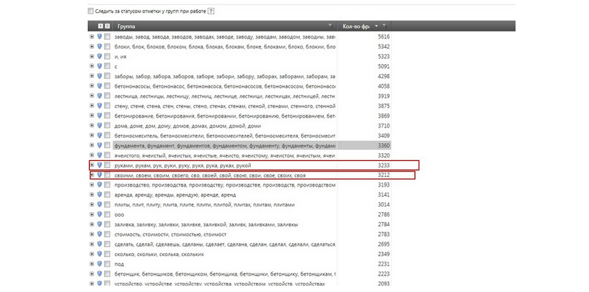 Все "мусорные" ключи помечаем галочками и убираем их. В нашем случае это группы со словами "руками" и "своими". Их коммерческий интерес - нулевой, так что они точно не нужны. Просмотрев лишь двадцатую часть всего списка можно избавиться от 10 тысяч "мусорных" ключевиков.