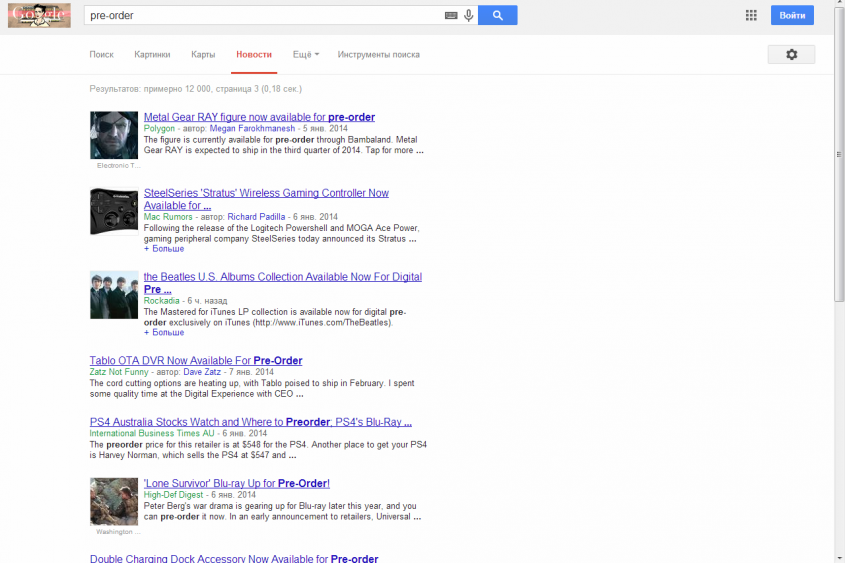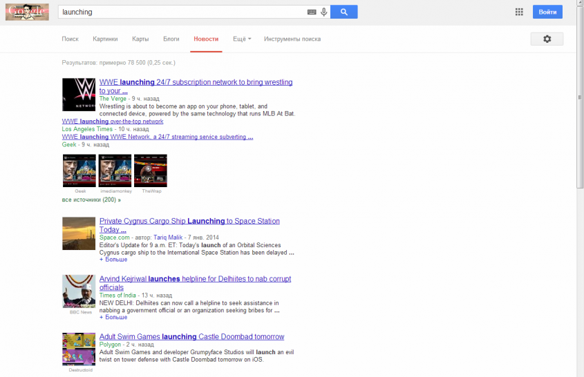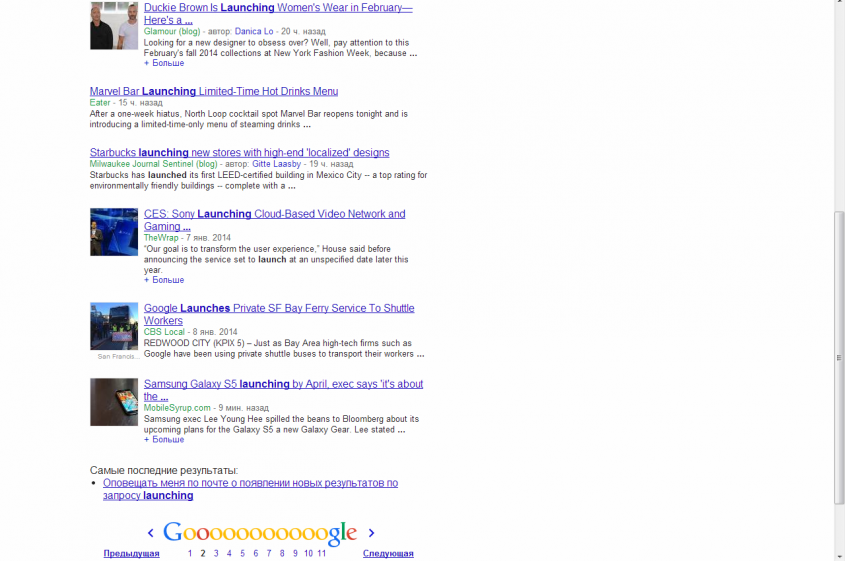 Заходим в Гугл Новости и вбиваем в строку поиска "launching" (запуск в продажу). В результате выдачи получаем полотно новостей: