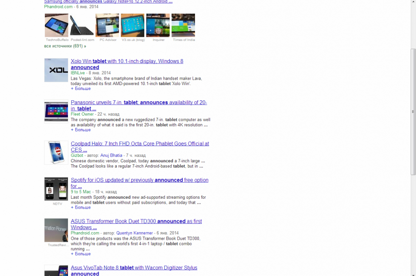 Заменяем запросЗапрос — слово или символ, вводимое в строке выдачи.Используется расширенный поиск:1) Оператор «+» (или кавычки) перед требуемым словом ищет запросы с…Перейти к словарю терминов "announced" на "announced tablet" (анонсы планшетов). И смотрим выдачу: