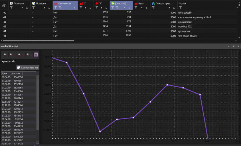 Блок «Not linking to domain» показывает запросы исследуемого сайта, получающие какие-то бонусы от Google, в каких именно блоках они выводятся. Чтобы получить объективную картину, надо сгладить сезонностьСезонность - характерная зависимость уровня активности аудитории сайта от периода года. Данный термин используется по отношению к определенным категориям…Перейти к словарю терминов – посмотреть статистику по запросу за последний год. Довольно часто приходится сталкиваться с ситуацией, когда число объектов из SERPFeatures вырастает на 5-10 % за год. Эта тенденция усиливается фактом попадания на первые позиции всевозможных «улучшенных» сайтов по самым востребованным запросам. Это и ведет к падению трафика ресурса, не принимающего участие в подобных ухищрениях.