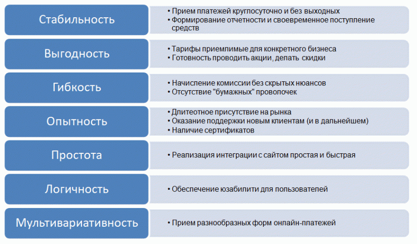 Существуют определенные приоритеты в вопросе: какие способы оплаты предложить клиентам интернет-магазина, других продающих проектов. К основным критериям относятся следующие: