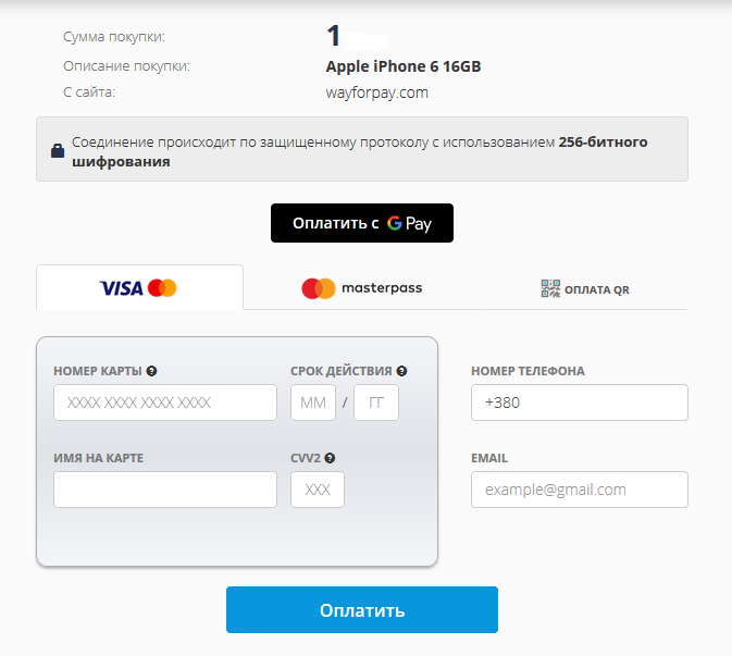 Безопасность системы подтверждается сертификатом PCI DSS. Пример платежной страницы системы приведен ниже: