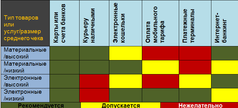 В таблице приведена допустимость одного из способов оплаты относительно типов товаров и оборотов бизнеса.