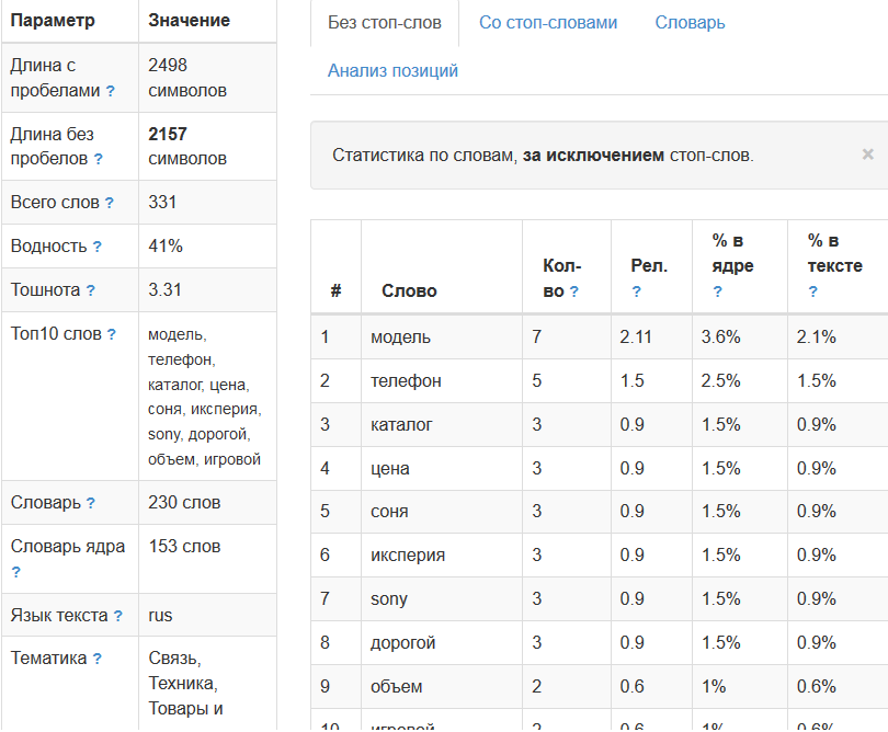 Istio.com аналитический инструмент, с помощью которого легко увидеть такие проблемы как завышенная плотностьKeyword Frequency или частотность (плотность) ключевого слова - соотношение в процентах между количеством вхождений ключевого слова и текстом в целом. Также данный термин…Перейти к словарю терминов слов в тексте или фрагменте. Что особенно удобно, когда рекомендовано равномерное распределение ключевиков и желательно избежать частого повторения предлогов, союзов, прочего. У сервиса есть несущественный недостаток: определение темы не всегда отвечает действительности.
