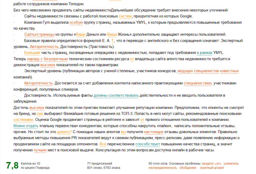 Главред и Главред Вета. Это уникальный и познавательный сервис, с которым просто приятно работать и узнавать что-то новое. Доступна проверка в интерактивном режиме. Пользователь заменяет проблемные места (они выделены цветом) и тут же получает ответ, насколько улучшился текст. Кроме того, по полученным маркерам даются лаконичные рекомендации.