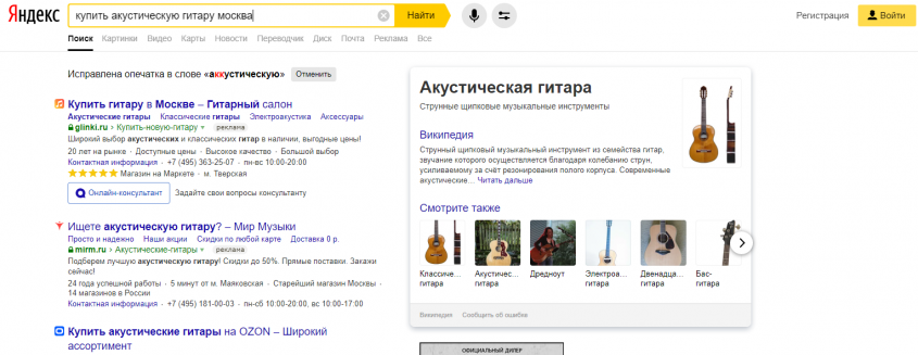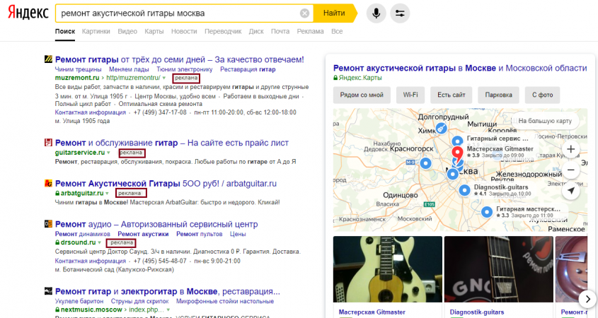 Есть простой поисковый запросЗапрос — слово или символ, вводимое в строке выдачи.Используется расширенный поиск:1) Оператор «+» (или кавычки) перед требуемым словом ищет запросы с…Перейти к словарю терминов : «ремонт акустической гитары». Здесь пользователи найдут сплошные лайфхаки вплоть до 15 позиции. И это еще не худший вариант. Добавление топонима «Москва» меняет поисковую выдачу до неузнаваемости.