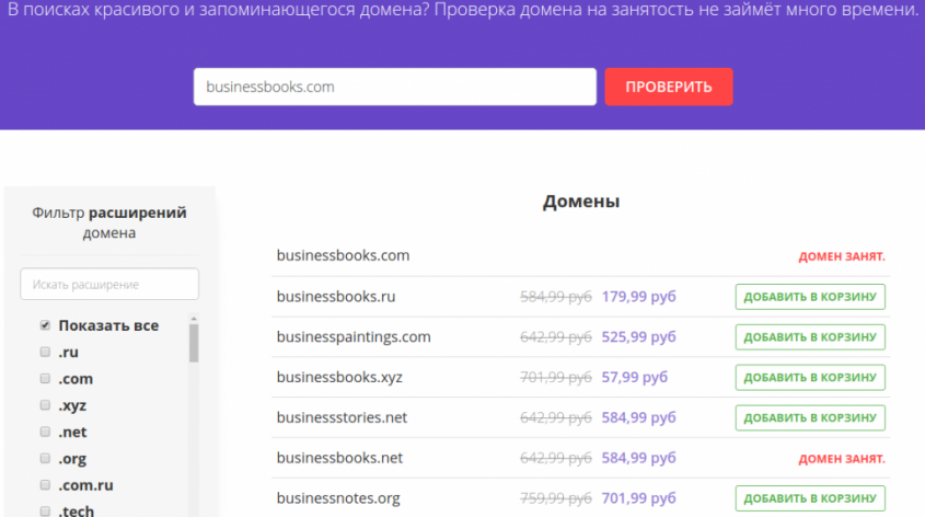 Доменные имена находятся через всевозможные сервисы: аналитические, поисковые, прочие. Это может выглядеть, как на примере ниже или как-то иначе с добавлением надписей о «свободе» имени: