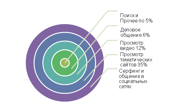 Если присмотреться внимательней к подготовленной таблице, можно заметить, что большую часть времени пользователь занимается личными или рабочими вопросами. Всего 5% времени от общей пользовательской активности отдается поиску товара или услуги. Подробнее о распределении внимания ЦА в сети показано на диаграмме ниже.
