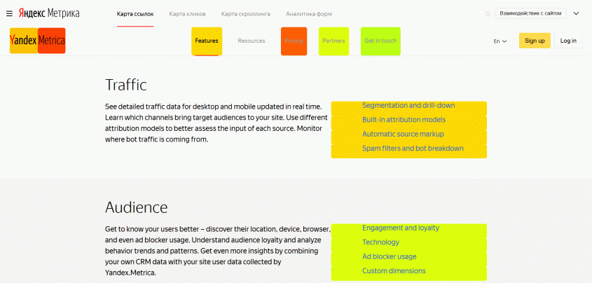 С помощью этого инструмента определяют не только самые кликабельные объекты. Если проскроллировать страницу до конца, то просматриваются элементы, которые также вызывают интерес пользователей, ошибочно воспринимаемые за функциональные кнопки. Наличие такие локаций на странице означает, что посетители сайта ожидают больше информации по сути запроса или содержимого рекламного объявления. Чтобы поисковая система не снижала документ в рейтинге, необходимо вносить изменения, дополняющие уже опубликованный контент.