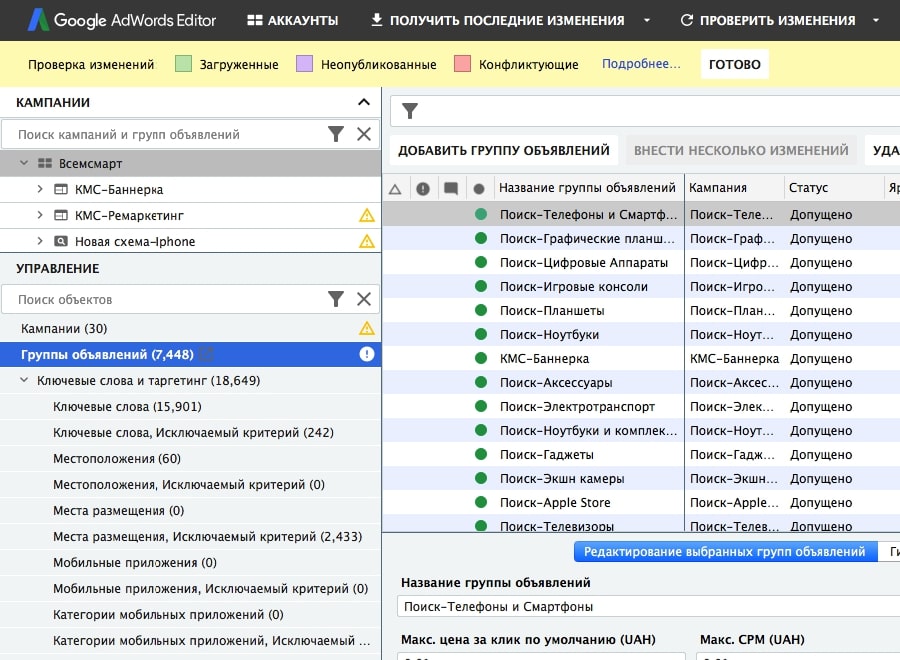 Особенности работы с контекстной рекламой упираются не только в подбор целевой аудитории. Нам необходимо распределить объявления по группам относительно ключевых слов и их исключений, допустимости размещения объявлений на площадках определенного типа. На скриншоте справа вы увидите прочие параметры, по которым необходимо производить настройку.
