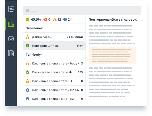 Тут главным образом нужно убедиться в уникальности имеющихся текстов, а также проанализировать плотностьKeyword Frequency или частотность (плотность) ключевого слова - соотношение в процентах между количеством вхождений ключевого слова и текстом в целом. Также данный термин…Перейти к словарю терминов ключевых слов. Нужно, чтобы важные ключи располагались в titleTitle (в переводе с английского языка "название, заглавие", жаргонно - титул или тайтл) - основной заголовок, которые не демонстрируется на веб-странице, а…Перейти к словарю терминов (лучше всего в самом начале). В таком случае именно им поисковые системы придают веса. При этом повторение слов в данном тэге ("бытовая техника в СПб, купить бытовую технику") плохо воспринимается поисковыми системами. Это считается избыточной оптимизацией, которая может привести к понижению позиций или даже бану.